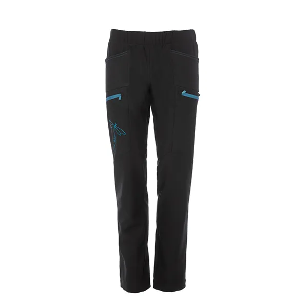Hladký design kalhot je doplněn mnoha decentními ozdobnými prvky - výšivka vážky na pravé kapse, ozdobné prošití kapes na ruce a kontrastní zipy.