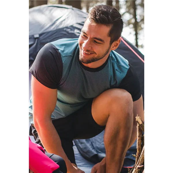 Pánské funkční triko s krátkým rukávem. Barva: khaki + tyrkysová / černá